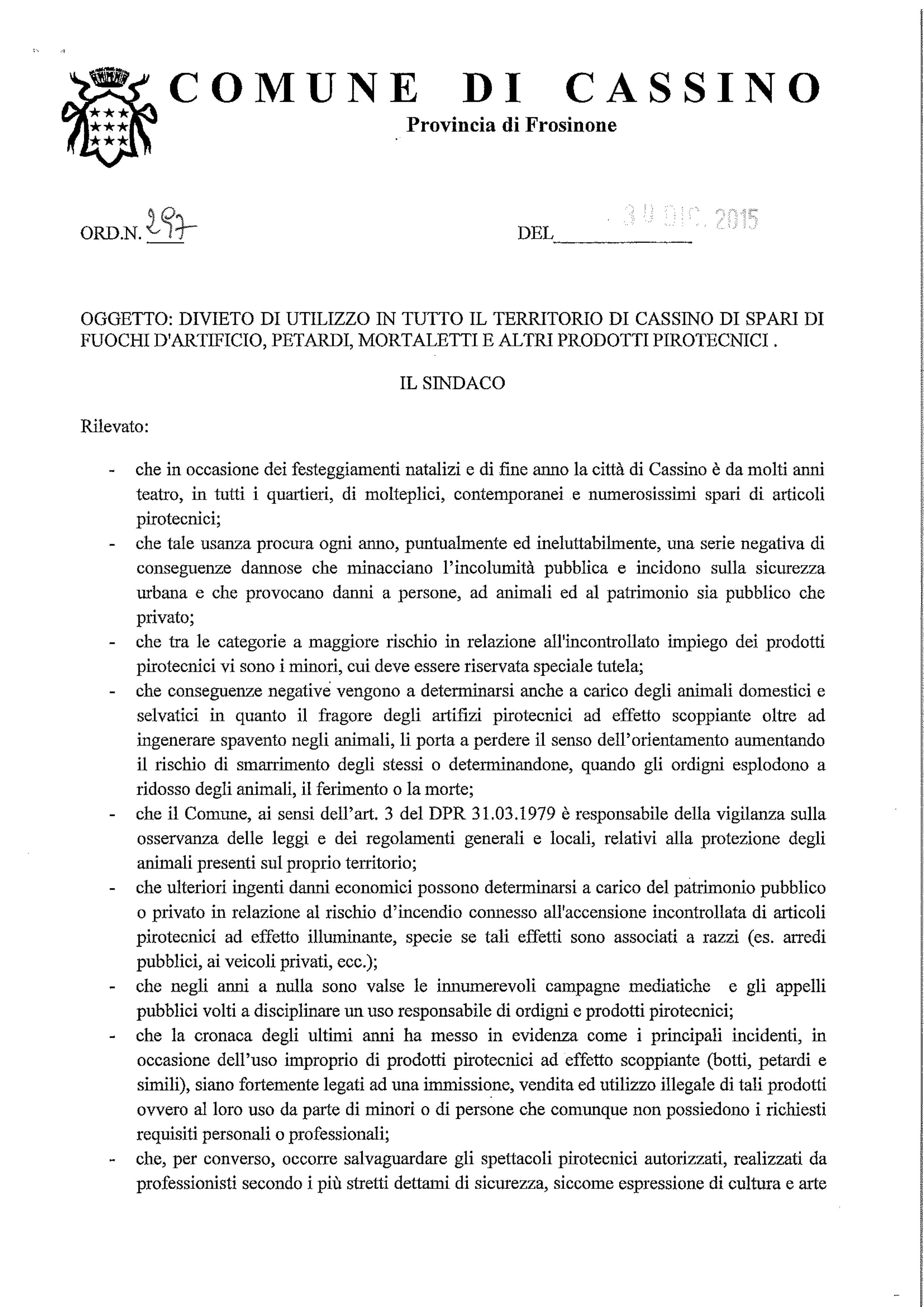 ordinanza 1ordinanza2Da oggi fino a tutto il primo gennaio 2016 è vietato l’utilizzo in tutto il territorio di Cassino di spari, fuochi di artificio, petardi mortaletti ed altri prodotti pirotecnici.” A renderlo noto il sindaco di Cassino, Giuseppe Golini Petrarcone, a seguito della pubblicazione dell’ordinanza che vieta i cosiddetti botti di capodanno. “Ogni anno – ha continuato il sindaco – a livello nazionale, aumenta sempre più il numero di infortuni, anche di grave entità, causati dall’uso, sempre più frequente, di petardi, botti e artifici pirotecnici per festeggiare la notte di Capodanno. La vasta diffusione dei botti, anche illegali e altamente pericolosi, in questo periodo dell’anno aumenta i rischi legati al loro uso, che spesso avviene in assenza delle più elementari precauzioni per l’incolumità degli stessi possessori e di chi gli sta vicino, all’interno delle case o in altri luoghi inadatti. E sebbene questi prodotti facciano ormai parte di tradizioni e abitudini consolidate, è notevole lo stress che il fragore può provocare su anziani, bambini, soggetti cardiopatici e animali domestici. Proprio gli animali sono quelli, così come evidenziato dall’associazione Anpana, a risentire maggiormente dell’uso dei botti di capodanno. Senza parlare dei danni materiali che si possono verificare nelle abitazioni private o nei luoghi pubblici. Per tali motivi questo provvedimento si è reso necessario al fine di tutelare l’incolumità pubblica e la sicurezza urbana e per gestire le attività di prevenzione e contrasto, anche nelle situazioni in cui si verificano comportamenti che possono alterare il decoro urbano. In conclusione, al di là degli aspetti e dei divieti formali faccio appello a tutti i cittadini perché riconoscano la pericolosità dei ‘botti di capodanno’ per sè e per gli altri, soprattutto per i più piccoli. Il provvedimento, che è stato trasmesso a tutti gli organi di polizia, mira a garantire la dovuta sicurezza in occasione dei festeggiamenti per l’arrivo del nuovo anno.”