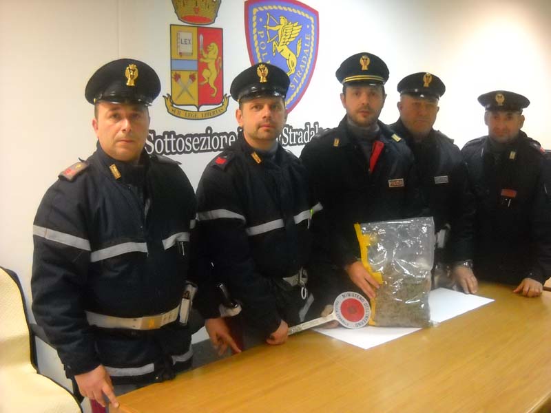 DSCN6806  gioNel corso della notte appena trascorsa personale della Sottosezione Polizia Stradale di Cassino, in servizio di pattugliamento autostradale, direzione Sud dell’A1, mentre sta transitando nel territorio ricadente nel comune della Città Martire, decide di controllare una Fiat 500 L. Il conducente, un ventiseienne partenopeo, appare agli agenti particolarmente nervoso tanto da destare in loro sospetti.I poliziotti decidono dunque di effettuare una ispezione dell’auto presa dal campano a noleggio.I sospetti trovano conferme quando sotto il sedile lato passeggero gli operatori di polizia trovano una busta di plastica contenente della sostanza di tipo vegetale.L’uomo viene accompagnato negli uffici della Sottosezione Polstrada per ulteriori accertamenti ed il contenuto della busta portato presso il Gabinetto Provinciale di Polizia Scientifica per le verifiche  di rito.L’esito degli esami sulla sostanza, del peso di oltre un chilo, danno esito positivo: si tratta di Mariujana.Il giovane è stato arrestato e dovrà rispondere dinanzi all’Auotirità Giudiziaria di detenzione ai fini di spaccio di sostanza stupefacente.