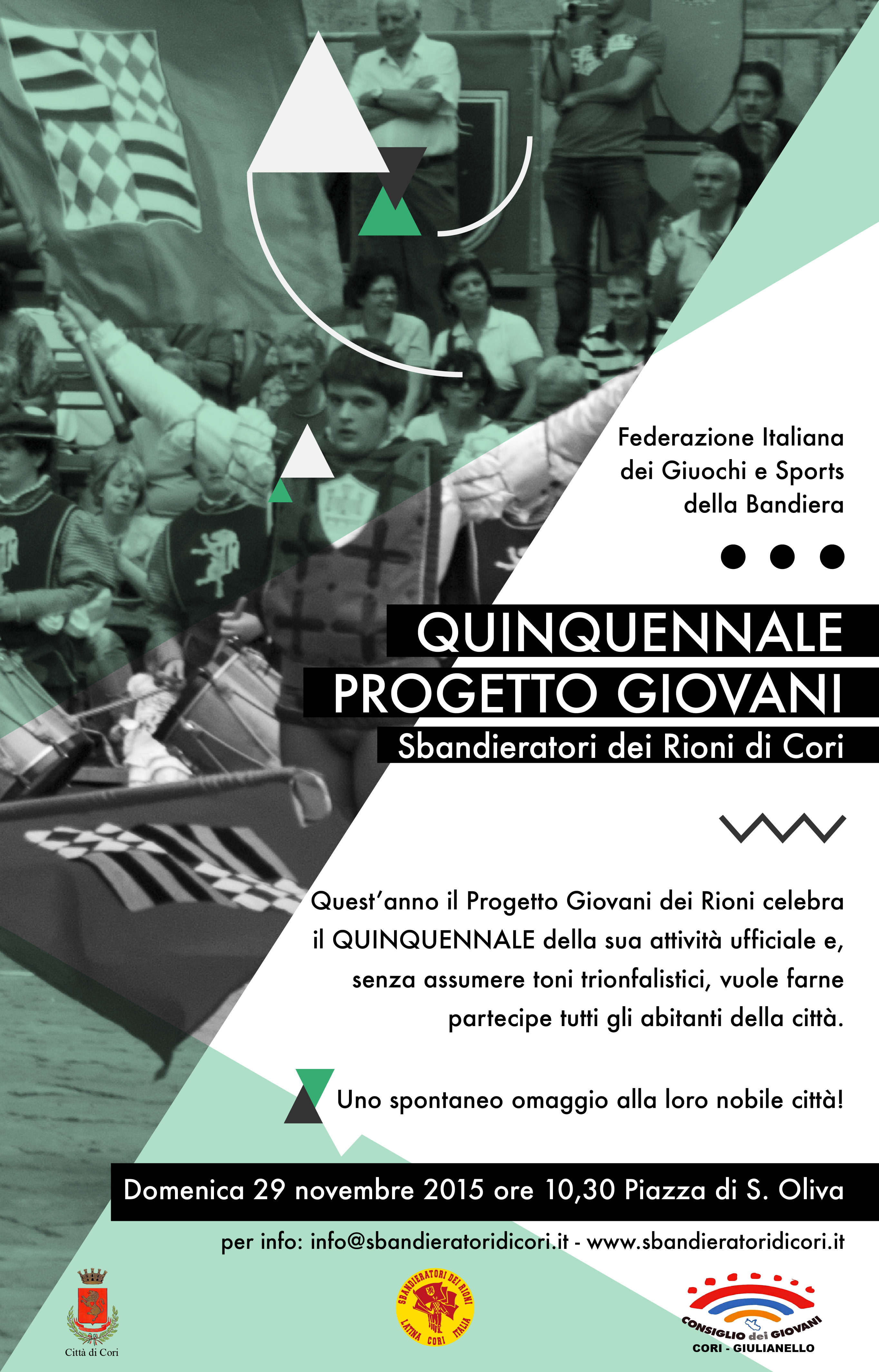 Il Progetto Giovani Sbandieratori dei Rioni di Cori compie cinque anni. Per rendere partecipe l’intera comunità dell’iniziale traguardo raggiunto dai giovani bandierai coresi, l’Associazione Sbandieratori dei Rioni di Cori, con il patrocinio del Comune di Cori e del Consiglio Giovani, festeggerà il quinquennale con uno splendido spettacolo che si rifà a quella scuola e tecnica di sbandieramento unica in tutta Italia, che proprio i Rioni per primi trapiantarono a Cori nel 1966. L’appuntamento è per domenica 29 Novembre 2015, alle ore 10:30, a piazza S.Oliva. Un momento che precederà lo storico anniversario del Cinquantennale dei Rioni, che il gruppo celebrerà il prossimo anno in grande stile. Il Progetto Giovani Sbandieratori dei Rioni di Cori nasce il 18 Febbraio del 2010 per insegnare “l’antica arte del maneggiar l’insegna” divertendosi. L’obiettivo dei Rioni infatti va oltre l’istituzione di un vivaio che garantisca il necessario ricambio generazionale alla Prima Squadra, volendo invece educare i giovani 8/15 anni ad un’attività sportiva di rilevanza sociale e culturale per l’intera città, che li assecondi in una crescita equilibrata, sia fisica che morale. Per questo si opera a stretto e costante contatto con le famiglie. Inoltre, puntando tutto sulla qualità, niente è lasciato al caso: il programma di allenamento è studiato nei minimi particolari e personalizzato, per accompagnare al meglio ciascun ragazzo durante tutto l’arco della stagione.A suon di uscite e riconoscimenti i Giovani Rioni in questo primo quinquennio hanno dato prova, sia in Italia che all’estero, di aver raggiunto un livello esibizionistico tale da poter rappresentare il folklore corese della bandiera e lo style dei Rioni, che attraverso performances eleganti, altamente coreografiche ed acrobatiche, costruite e perfezionate in anni di esperienza, con l’importante sostegno dei tamburini e delle chiarine rinascimentali, sono riusciti con professionalità e successo ad affascinare le genti di tutto il mondo. Gli Sbandieratori dei Rioni di Cori si allenano ogni sabato, dalle ore 15:00, presso la palestra della scuola elementare di Cori ‘Virgilio Laurienti’. Per maggiori informazioni: www.sbandieratoridicori.it e sulle pagine dei principali social media.
