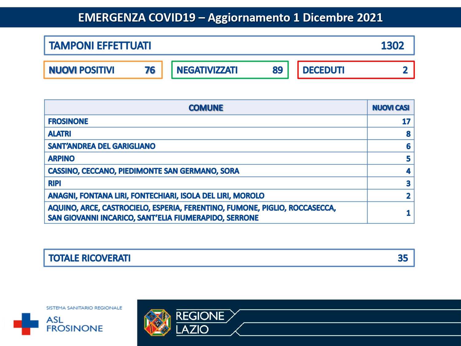 In 01/12/2021 si registrano due decessi nella provincia di Frosinone: un uomo di 90 anni residente a Ceccano e un uomo di 71 anni residente a San Giovanni Incarico entrambi con pregresse patologie.