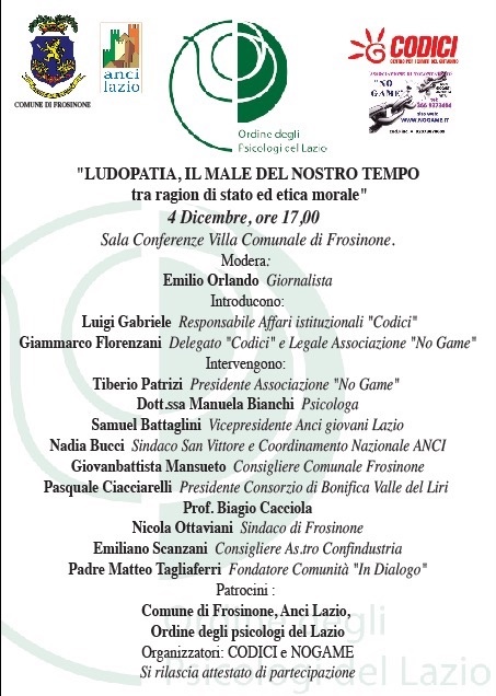 Il tema trattato è particolarmente caro alla Provincia di Frosinone, in quanto le statistiche dimostrano che la zona è particolarmente colpita dal fenomeno. La causa esatta della ludopatia al momento non è nota. Come per gran parte delle malattie psichiatriche, si ritiene che l’insorgenza della dipendenza dal gioco d’azzardo patologico sia legata all’interazione sfavorevole di fattori biologici, genetici e ambientali (in particolare, sul fronte relazionale, familiare, sociale, professionale). La formazione di questo tavolo di lavoro con esperti ed esponenti illustri, è volta ad avere una visione nuova per monitorare e arginare il fenomeno.
