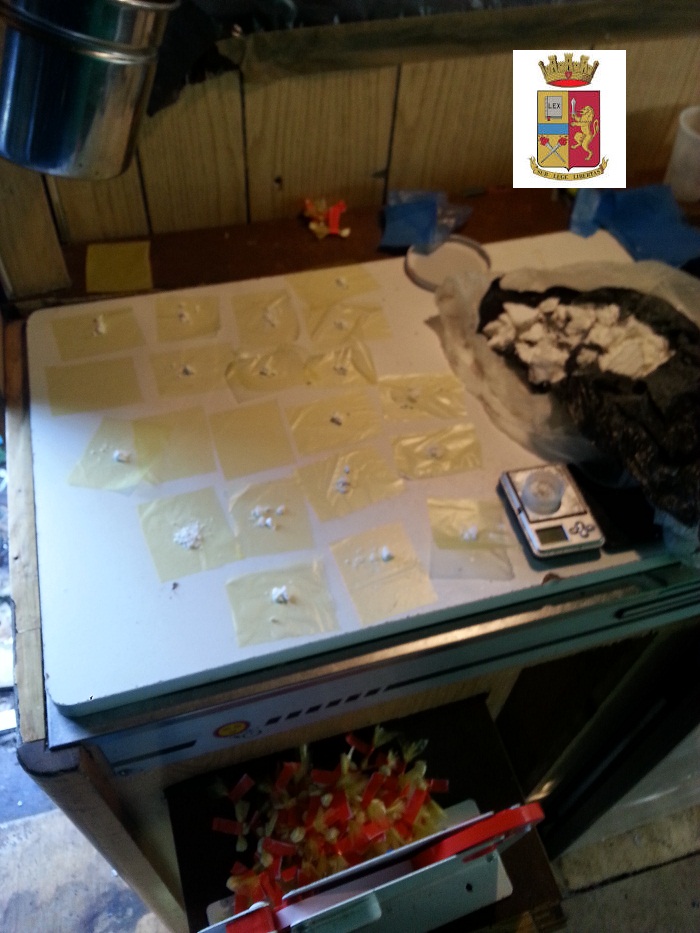 20151207_134127 gioNel pomeriggio di ieri una Volante, impegnata nei servizi di controllo del territorio nel capoluogo,  nel transitare in un strada periferica della parte bassa della città, nota un vecchio camper ed una moto parcheggiati in un campo incolto, quasi nascosti alla visuale dalla fitta vegetazione.Ad attrarre ancor di più l’attenzione degli agenti è il sopraggiungere presso il terreno di un uomo a bordo di un fuoristrada che entra nel caravan con fare circospetto.L’insolita situazione insospettisce i poliziotti tanto da richiedere l’intervento di altro personale di Polizia alla Sala Operativa della Questura.Sul posto giungono in ausilio ai colleghi altri equipaggi delle Volanti e della Squadra Mobile che, avvicinatisi con circospezione al mezzo, sorprendono due uomini ed una donna mentre sono impegnati nel confezionamento di dosi di quella che risulterà essere droga di vario genere.Su di un tavolo “imbandito” di tutto l’occorrente per lavorare e confezionare le diverse sostanze stupefacenti, custodite in panetti, ovuli e contenitori da cucina, i poliziotti trovano complessivamente 130 grammi di cocaina, 430 grammi di  hashish e 440 grammi di marijuana, come accertato dal Gabinetto Provinciale di Polizia Scientifica.Sempre in un barattolo da cucina vengono ritrovati 2.800 euro in pezzi di vario taglio, provento dell’attività di spaccio.Ad essere colti in flagrante, due fratelli di origine marocchina,  domiciliati a Veroli, lui ventenne, lei ventiquattrenne ed il presunto fidanzato di lei, un italiano domiciliato a Frosinone, dell’età di 31 anni.Dalle verifiche sulla moto trovata vicino all’autocaravan  emerge che il legittimo proprietario ne aveva denunciato il furto ad Aprilia circa 2 anni fa.I tre giovani, due dei quali con precedenti di polizia, sono stati arrestati per detenzione ai fini di spaccio di sostanza stupefacente e ricettazione, mentre la droga è stata sottoposta a sequestro.